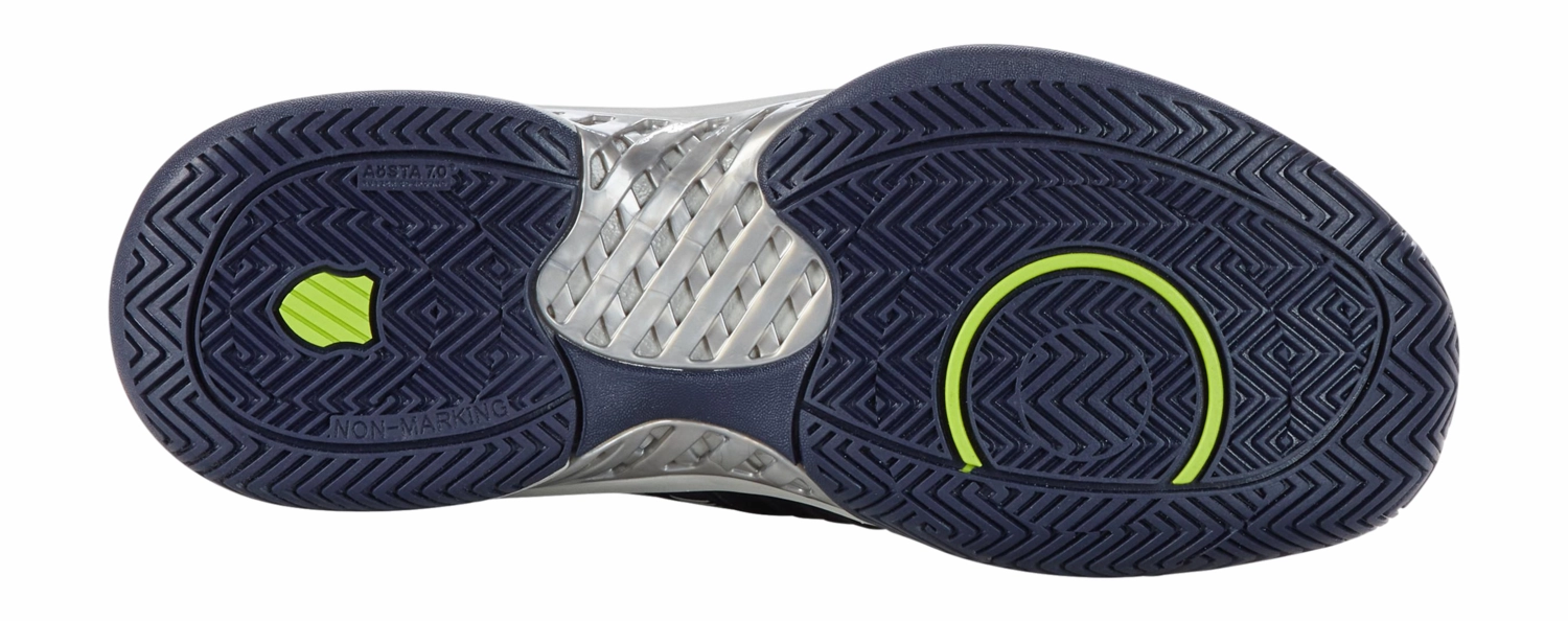 Les chaussures de tennis K-Swiss Men Express Light 3 en Peacoat, Gray Violet et Lime Green sont un excellent choix pour les hommes à la recherche de performances et de confort sur le court de tennis. Fabriquées à partir de matière synthétique à 100% avec une semelle en caoutchouc à 100%, ces chaussures légères sont dotées de technologies avancées qui offrent stabilité, amorti et durabilité. Avec le système 180 PSC Plantar Chassis, cette chaussure offre une stabilité autour de la voûte plantaire, tandis que la technologie K-EVA dans la semelle intermédiaire assure un amorti maximal. La technique Durawrap Flex offre protection et flexibilité, tandis que le composé en caoutchouc Aösta 7.0 garantit une durabilité de la pointe au talon. Avec les chaussures de tennis K-Swiss Men Express Light 3, vous obtenez une chaussure de tennis de haute qualité et fiable.