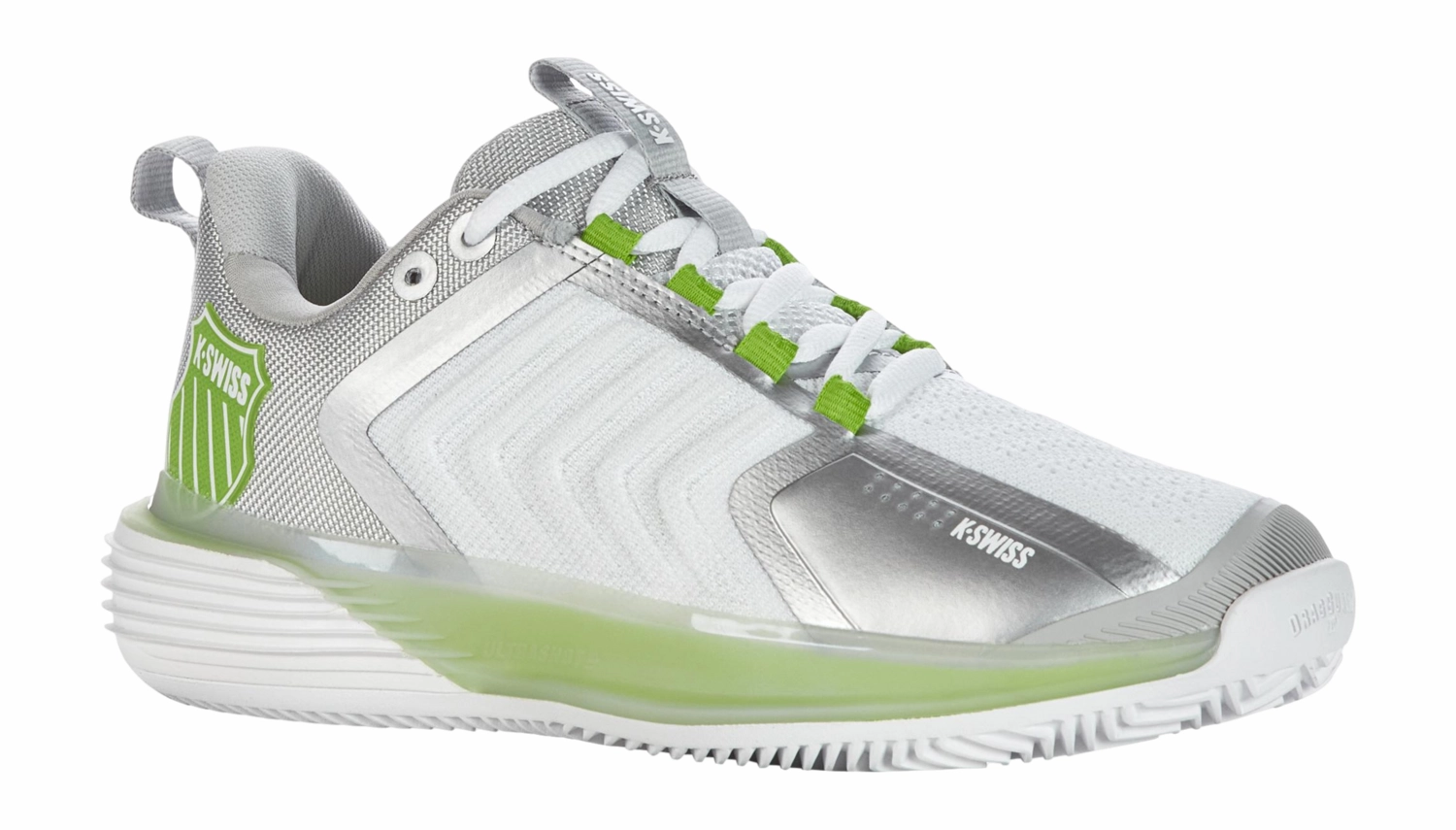 La marque K-Swiss est leader sur le marché des baskets. L’entreprise, créée en 1966, ne cesse de se développer et se présente comme une marque innovante, performante et de qualité. Les chaussures K-Swiss associent à la fois un design très tendance et un confort immédiat. On les repère très rapidement grâce aux 5 bandes sur le côté de la chaussure. N’attendez plus pour choisir votre basket de tennis! Chez TennisPlannet, vous trouverez votre chaussure idéale, que vous soyez un homme ou une femme! La chaussure de tennis K-Swiss Ultrashot 3 HB est un incontournable pour les joueuses de tennis compétitives, agressives et puissantes. Avec une palette de couleurs allant du blanc, au violet gris, en passant par le vert citron, cette chaussure est non seulement élégante mais aussi fonctionnelle. La tige 100% synthétique et la semelle en caoutchouc offrent durabilité et confort pendant le jeu. Grâce à sa grande respirabilité, vos pieds resteront frais et secs, même pendant les matchs les plus intenses. Portée par des athlètes professionnels de l’ATP et de la WTA, cette chaussure offre la combinaison parfaite de stabilité, de résilience et de traction. Avec des fonctionnalités telles que le disque de rotation dans la semelle, la technique Stay-tied et la technique Durawrap, vous êtes assuré de mouvements rapides, de lacets solides et d’une protection contre l’usure. De plus, la technologie Aösta 7.0 en caoutchouc, le composé de mousse Surge 7.0, le Dragguard 7.0, le Slideguard et le châssis 360 PSC Plantar offrent une performance optimale. La chaussure est également dotée de DuraMesh avec des fils TPU insérés pour une respirabilité accrue et un soutien supplémentaire. Les orteils et le talon de la chaussure sont protégés grâce à la technologie Dragguard 7.0. Les motifs en forme de chevrons sur la semelle offrent une excellente traction sur terre battue. Convient aux femmes sérieuses dans leur jeu de tennis, ces chaussures de tennis sont le choix idéal pour améliorer vos performances.