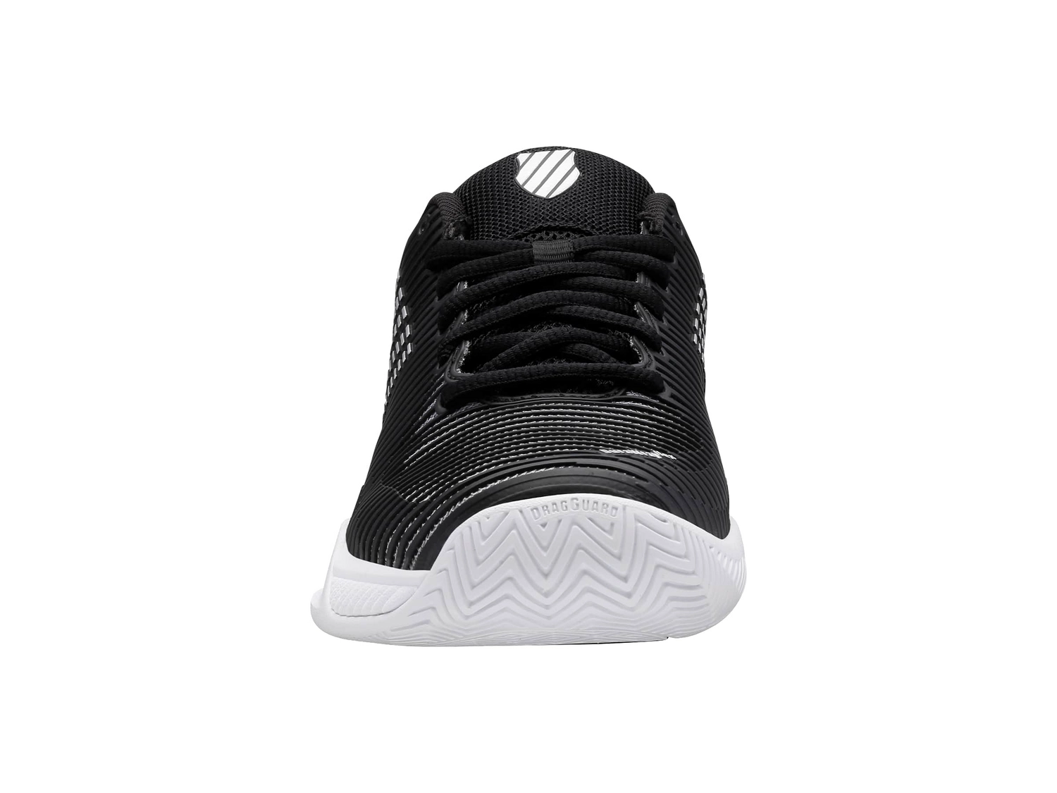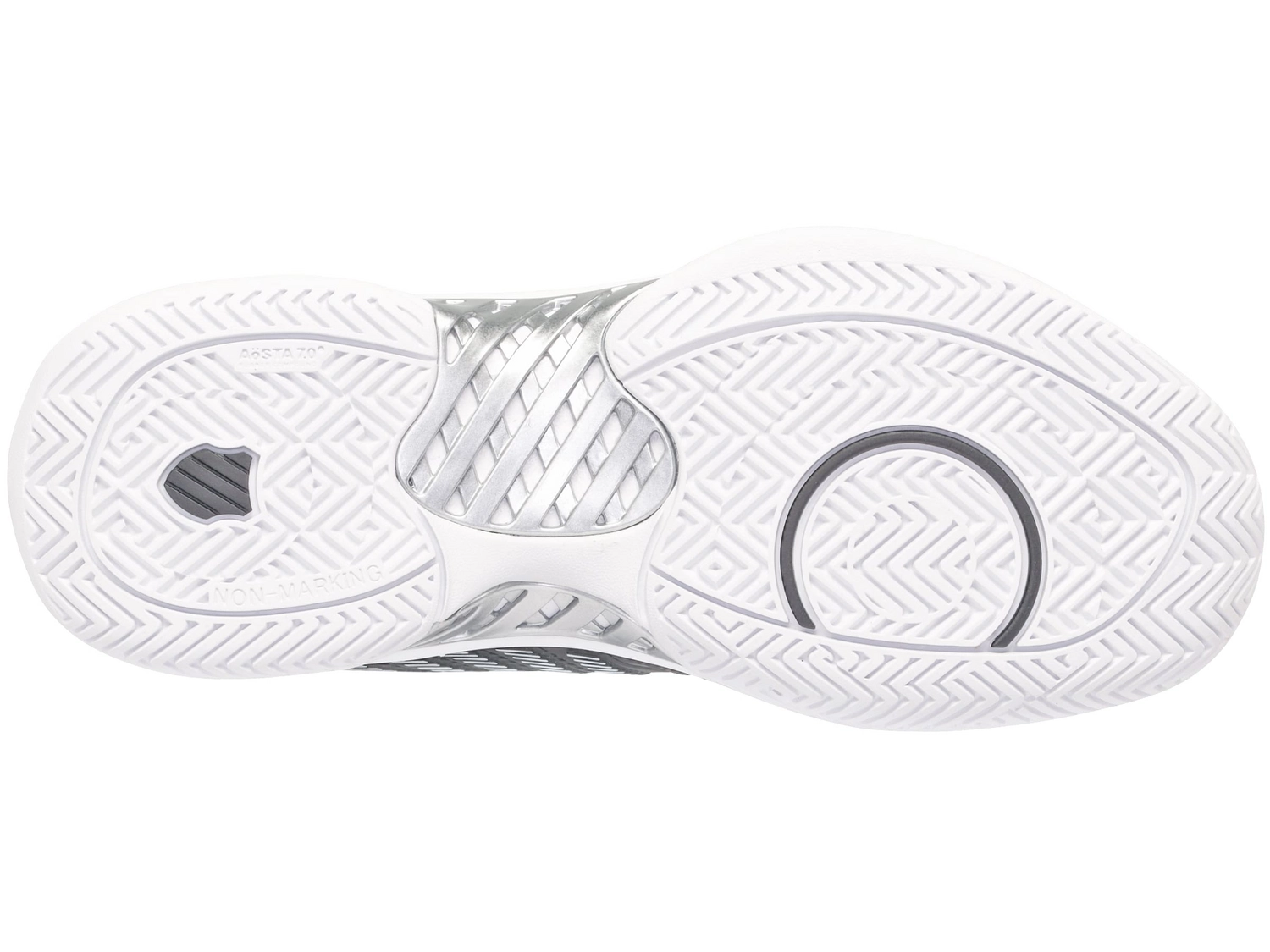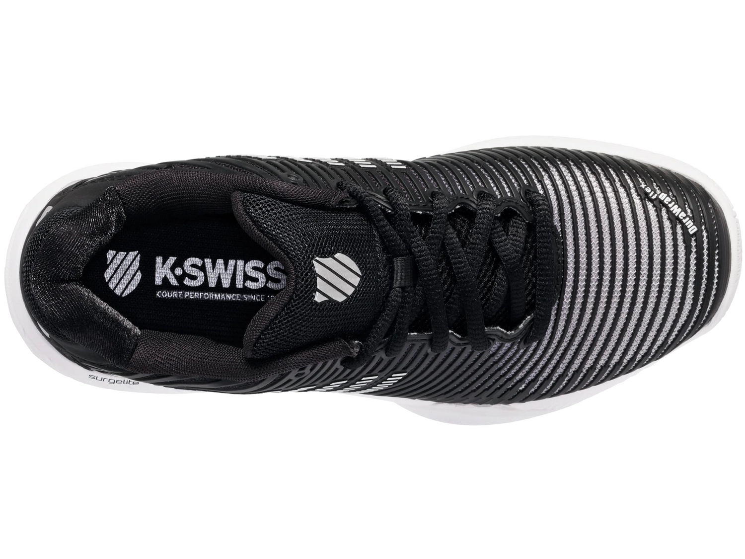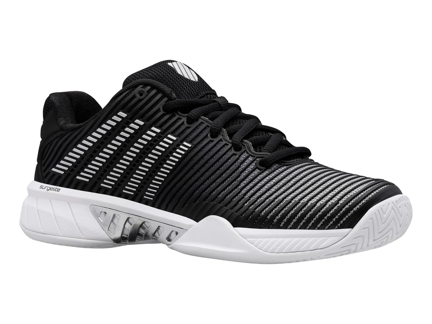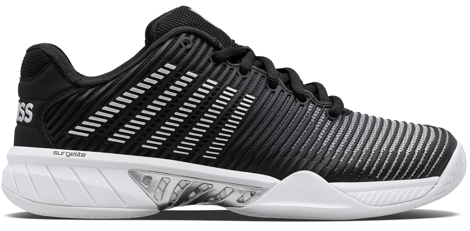Les chaussures de tennis K-Swiss Hypercourt Express 2 Noir Blanc Argent sont des chaussures de tennis classiques dotées des derniers matériaux et technologies. Grâce à leur profil en chevrons, ces chaussures conviennent parfaitement à la terre battue, à la terre battue artificielle et au gazon artificiel. Elles sont dotées de maille sur la languette et la tige, ce qui leur confère une excellente respirabilité, gardant vos pieds frais et secs. De plus, la maille est légère mais offre un confort agréable et un bon soutien. Les chaussures sont imperméables, ce qui les rend légères et garde vos pieds au sec lors d’une averse. De plus, elles sont composées de différentes couches de semelles. La semelle intermédiaire Surgelite offre un bon amorti et une grande durabilité. La semelle intérieure Ortholite offre également un léger amorti, tandis que le DuraWrap et le DragGuard sur la semelle extérieure assurent une protection supplémentaire aux points d’appui essentiels de la chaussure. Le motif en chevrons profonds de la semelle extérieure en caoutchouc rend ces chaussures adaptées à la terre battue, à la terre battue artificielle et au gazon artificiel. Les chaussures de tennis K-Swiss Hypercourt Express 2 Noir Blanc Argent sont parfaites pour les femmes qui recherchent des chaussures de tennis performantes et durables.