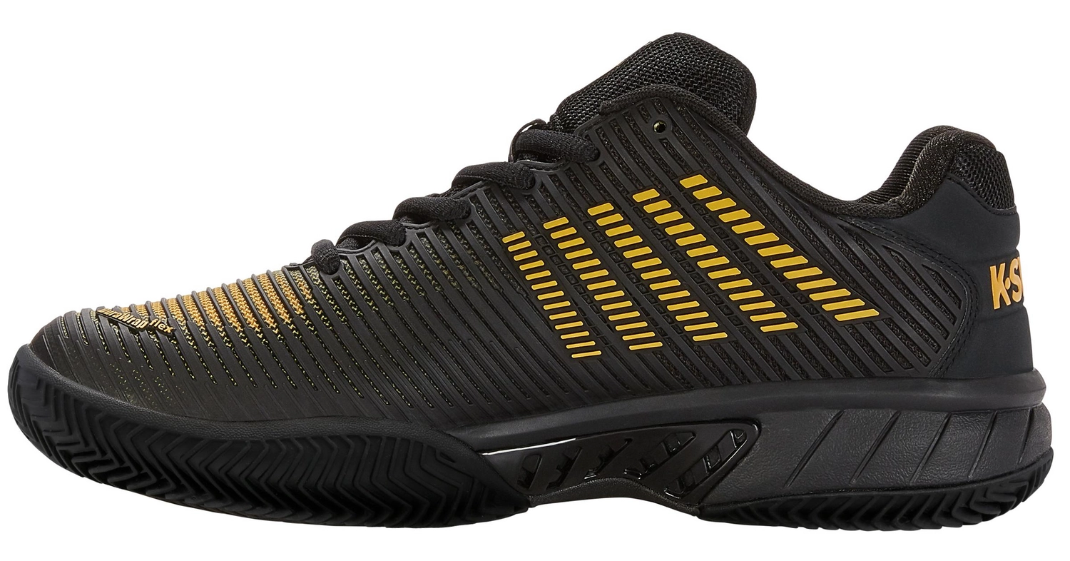 L’Hypercourt Express 2 HB de K-Swiss est une chaussure de tennis classique équipée des derniers matériaux et technologies. Grâce au profil à chevrons, la chaussure est parfaitement adaptée au gravier, au smash court et au gazon artificiel. La chaussure est équipée de mesh au niveau de la languette et de la tige. En conséquence, la chaussure a une grande respirabilité, gardant vos pieds au frais et au sec. De plus, la matière en mesh est légère, mais offre un confort agréable et un bon maintien. La chaussure est hydrofuge, de sorte que les chaussures ne deviennent pas lourdes et que vos pieds restent au sec pendant une averse. De plus, la chaussure est composée de plusieurs couches de semelles. La semelle intercalaire Surgelite offre une bonne absorption des chocs et une bonne durabilité. La semelle intérieure Ortholite offre également un amorti léger et les DuraWrap et DragGuard dans la semelle extérieure offrent une couche de protection supplémentaire sur les points d’appui essentiels de la chaussure. Les chevrons profonds de la semelle extérieure en caoutchouc rendent la chaussure adaptée au gravier, au terrain de smash et au gazon artificiel.
