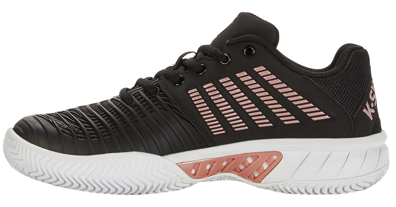L’Express Light 3 HB de K Swiss est une chaussure de tennis lĂ©gère idĂ©ale pour le joueur qui recherche les meilleures performances avec un haut niveau de confort. Ce nouveau modèle succède Ă son prĂ©dĂ©cesseur Ă succès, l’Express Light 2 HB de K Swiss. Cette conception comprend une tige DuraWrap Flex, une cage RPU moulĂ©e nouvellement dĂ©veloppĂ©e qui offre une protection contre la traĂ®nĂ©e et un support flexible. Avec une coupe rĂ©gulière et une tige en cuir synthĂ©tique avec maille, la chaussure offre une excellente combinaison de confort et de maintien. Grâce au matĂ©riau en mesh au niveau de la languette et de la tige, la chaussure peut bien s’aĂ©rer pour que vos pieds restent au sec et au frais. De plus, la chaussure est composĂ©e de diffĂ©rents types de couches de semelles. La semelle intercalaire K-EVA offre une absorption maximale des chocs et une excellente durabilitĂ©. De plus, la semelle intermĂ©diaire 180 PSC offre le soutien nĂ©cessaire lors des mouvements latĂ©raux. La semelle extĂ©rieure en caoutchouc Aosta 7.0 a Ă©galement une densitĂ© Ă©levĂ©e qui offre une durabilitĂ© supplĂ©mentaire. La semelle extĂ©rieure est en outre Ă©quipĂ©e de DuraWrap qui offre une couche de protection supplĂ©mentaire sur les points d’appui essentiels de la chaussure. La chaussure a Ă©galement un bord intĂ©rieur bien rembourrĂ© autour des chevilles pour plus de confort et de stabilitĂ©. La semelle intĂ©rieure Ortholite offre un amorti et une rĂ©ponse au pied. L’Express Light 3 possède Ă©galement une semelle extĂ©rieure HB avec un profil Ă chevrons profonds pour une adhĂ©rence exceptionnelle sur les courts en terre battue.