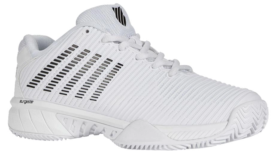 L’Hypercourt Express 2 HB de K-Swiss est une chaussure de tennis classique équipée des derniers matériaux et technologies. Grâce au profil à chevrons, la chaussure est parfaitement adaptée au gravier, au smash court et au gazon artificiel. La chaussure est équipée de mesh au niveau de la languette et de la tige. En conséquence, la chaussure a une grande respirabilité, gardant vos pieds au frais et au sec. De plus, la matière en mesh est légère, mais offre un confort agréable et un bon maintien. La chaussure est hydrofuge, de sorte que les chaussures ne deviennent pas lourdes et que vos pieds restent au sec pendant une averse. De plus, la chaussure est composée de plusieurs couches de semelles. La semelle intercalaire Surgelite offre une bonne absorption des chocs et une bonne durabilité. La semelle intérieure Ortholite offre également un amorti léger et les DuraWrap et DragGuard dans la semelle extérieure offrent une couche de protection supplémentaire sur les points d’appui essentiels de la chaussure. Les chevrons profonds de la semelle extérieure en caoutchouc rendent la chaussure adaptée au gravier, au terrain de smash et au gazon artificiel.